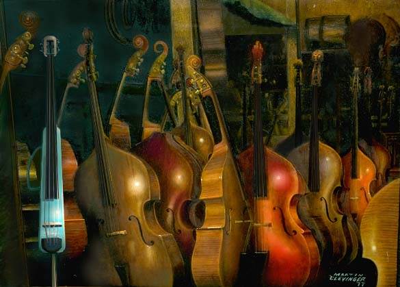 The Electric double bassThe lofty goalTo create an electric bass which sings with the bow as well as pizzicato, allows the player to express their total range of musical energy, provides a solid foundation in ensembles of any size, sounds as good as a fine acoustic double bass, and features audibility advantages of electric instruments. The newcomer An adaptation of an oil painting, circa 1977 by Martin Clevinger Inspiredby a photograph on the frontispiece of Sir Raymond Elgars book: Looking at the Double Bass. Original artwork by Martin Clevinger, 1996. A limited number of high quality prints are available upon request. Please contact Martin Clevinger at [email protected] ,ask for "The newcomer print" These are a limited series printing done professionally on an Iris printer and suitable for framing. **Pricing has yet to be determined**