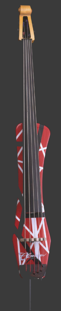 As and instructional tool for learning good intonation, there is simply no better means. The bassist is now able to essentially play a duet with him or herself. Your playing partner, the MIDI device, has impeccable intonation (with pitch bend setting OFF). You may now adjust the volume mix between yourself and your MIDI "partner's" voice, and as you gain confidence, you can increase your own volume, The results of this type of practice are astounding. Even a veteran player will be made aware of his or her intonation problems. INVISIBLE FRETS: Precision bass? For the first time, the double bassist can play absolutely in tune even if the bassist can't hear the instrument. This is achieved by using the MIDI voice with the chromatic setting (pitch bend OFF). It's like having INVISIBLE FRETS. Eddie Van Halen's Custom Clevinger